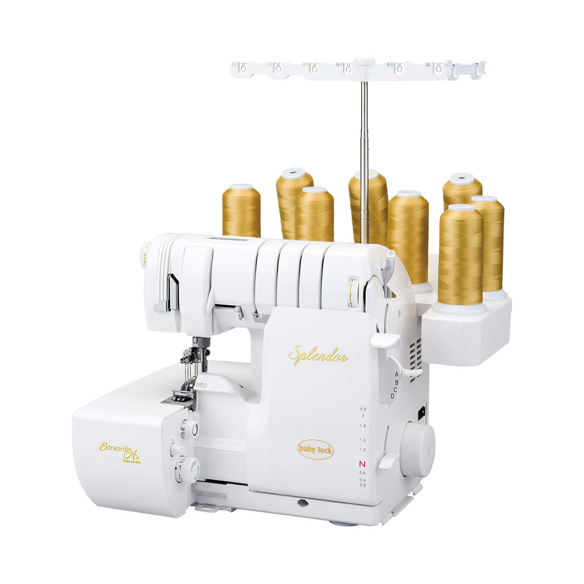 Threading an overlocker has traditionally been one of the biggest frustrations—but not with the Splendor. The ExtraordinAir™ Threading System uses a jet of air to instantly thread the loopers at the touch of a button. Threads can be inserted in any order, and individual threads can be changed without rethreading the entire machine. This dramatically reduces setup time and makes the machine far more approachable, even for beginners.