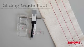 The Janome Sliding Guide Foot makes edge stitching a breeze by allowing you to quickly adjust the flange up to an inch from the edge of the foot. This easy adjustment is made possible by lifting the lever in the back of the foot, eliminating the need for fiddling with screws. The clear markings help ensure accurate alignment for perfectly straight hems every time. Compatible with Janome 7mm models.