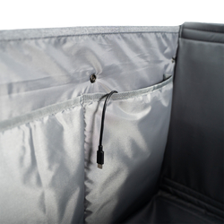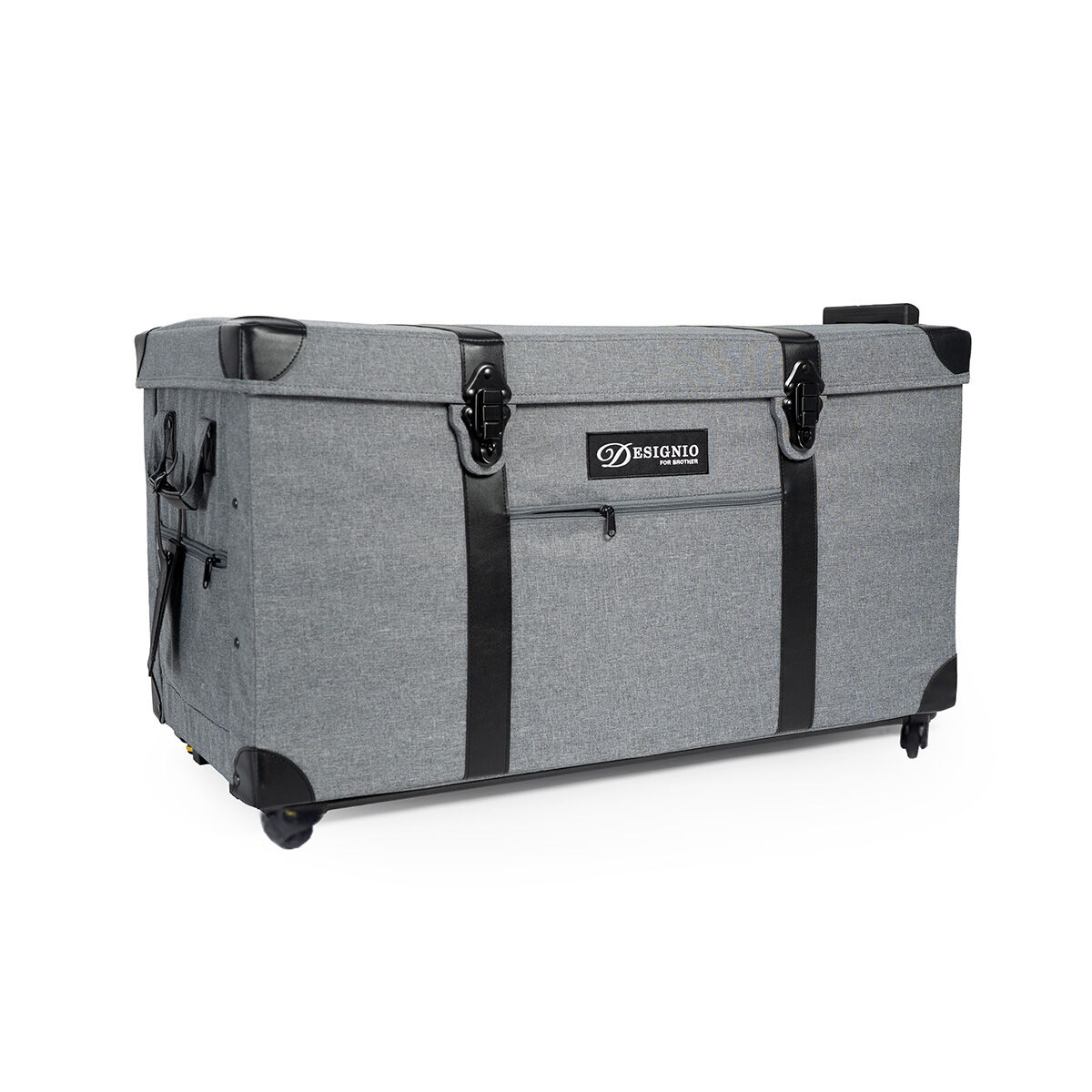 The main trunk and arm tote are built for protection, convenience, and mobility. With classic black metal latches, sturdy side handles, and a telescopic handle with smooth 360° wheels, transport is seamless. Thoughtful features like two zippered side pockets, a luggage tag, and a C-to-C charging port add a modern edge to this retro-inspired design. When not in use, the wheels are easily removable, allowing for streamlined storage in your sewing space.