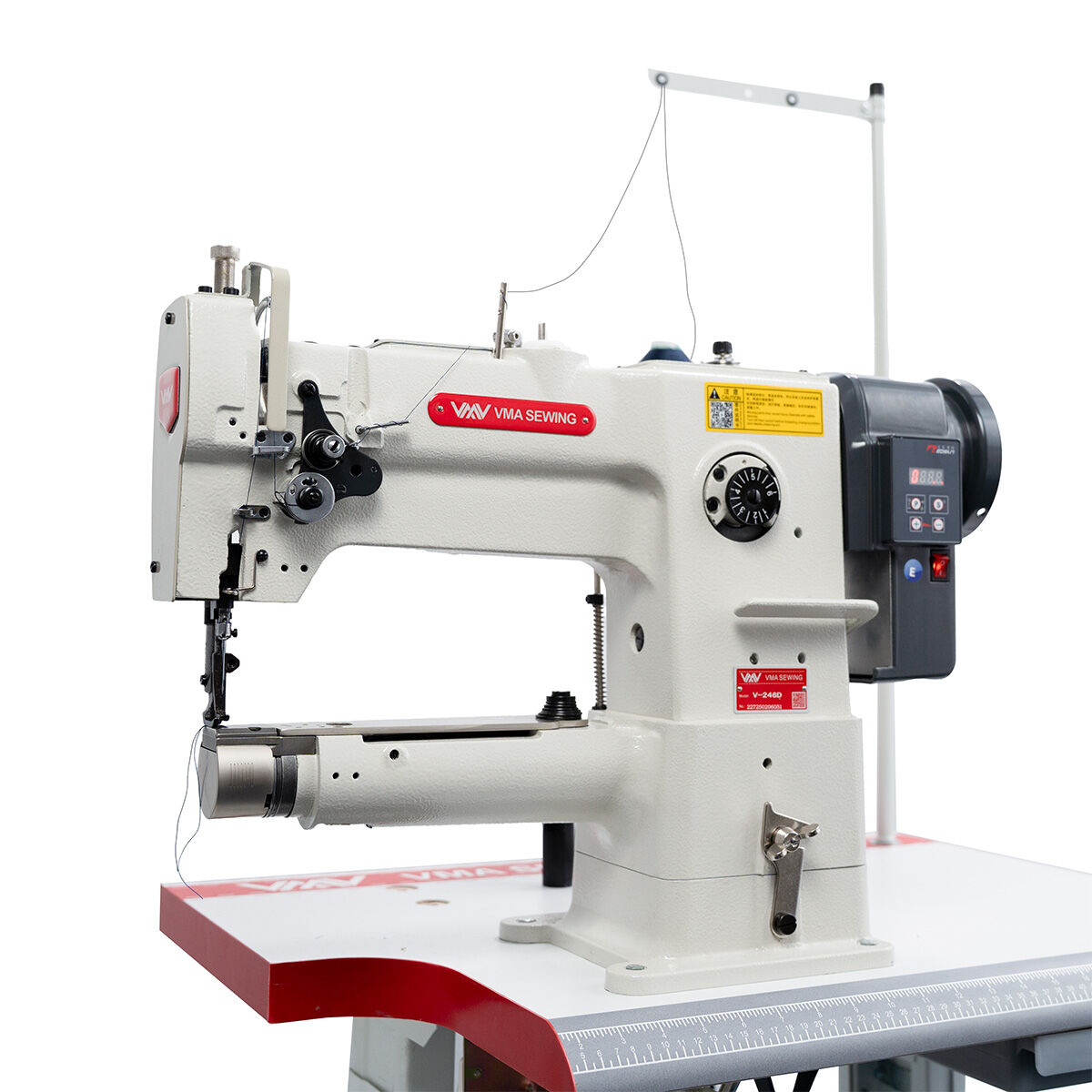 The machine’s variable speed control allows precise adjustment for different materials and project requirements, offering both slow, controlled stitching and high-speed production.